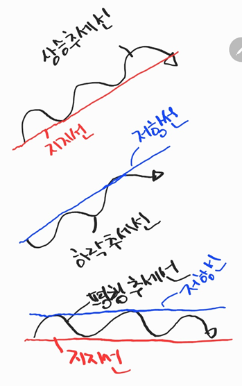 저점과 저점을 이은선을 지지선이라고 하고 고점과 고점을 이은 선을 저항선이라고 합니다.