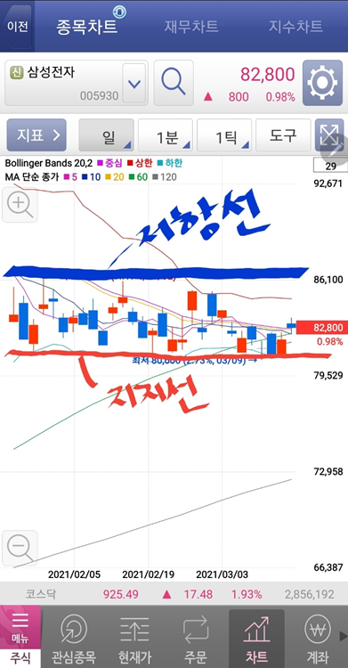 지지선은 주가가 일정 수준으로 내려오면 더 이상 내려가지 않으려고 하는 지점을 선으로 이은 것입니다.