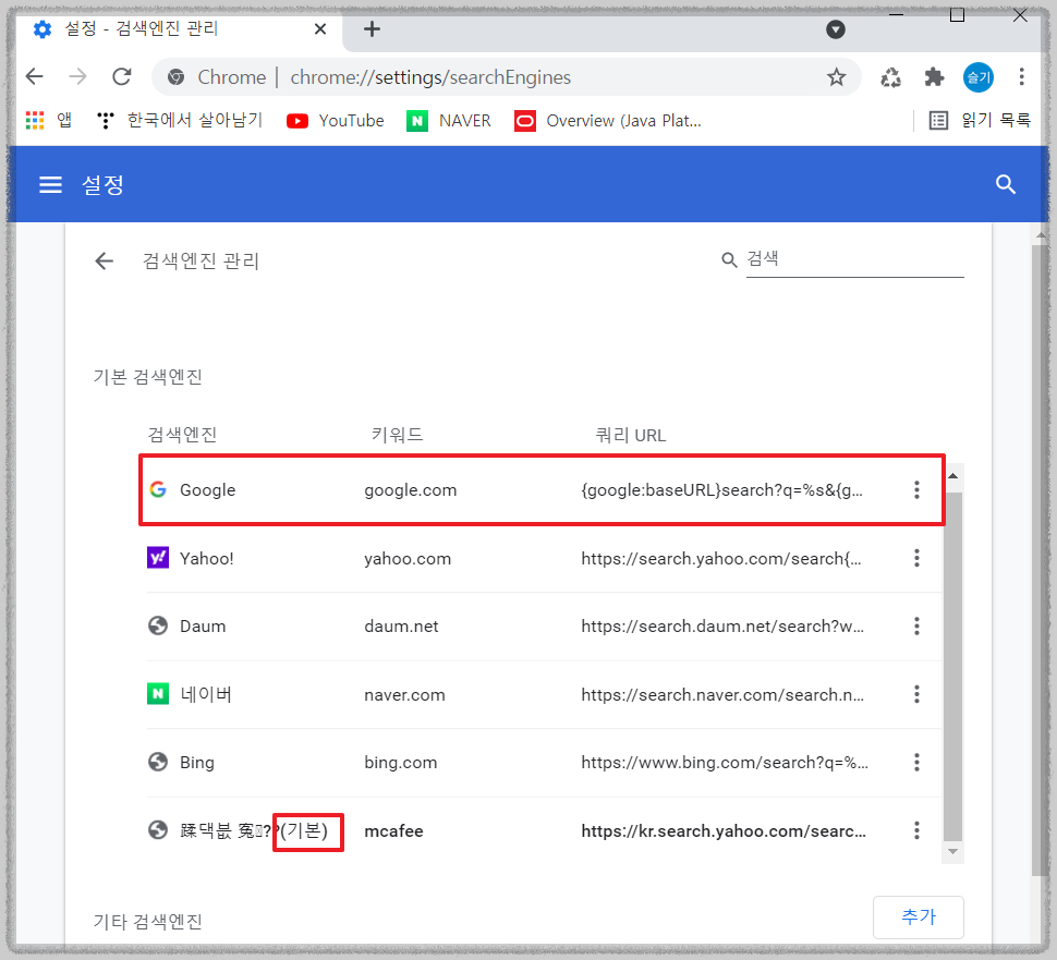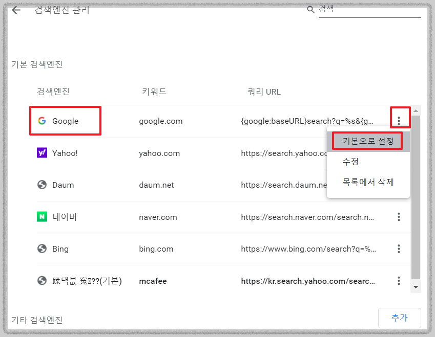아래와 같이 구글을 기본으로 설정해주면 됩니다 ^^!!