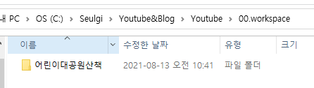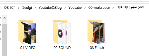 이해하기 쉽게 어린이대공원을 주제로 한 동영상을 찍었다고 합시다! 그러면 편집해야할 어린이대공원산책vlog(edit)를 작업하기 위해 workspace(작업공간)에 넣고 edit폴더에 하위폴더인 video, sound, finish를 만듭니다.