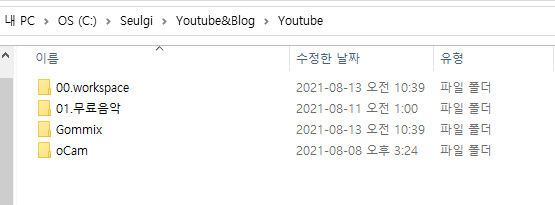 예를들어 workspace라는 작업공간에 편집해야할 동영상 edit라는 폴더 생성하고 하위 폴더로 video와 sound finish를 생성하고 영상은 video 폴더에 소리나 음악은 sound 폴더에 완성된 mp4는 Finish에 넣습니다.