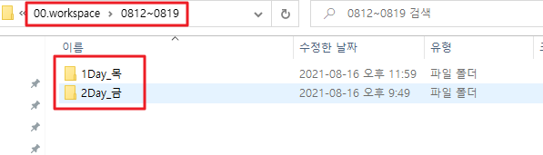 workspace 아래에 주별로 정리(0812~0819)하고, 그 아래에 day별로 정리합니다.