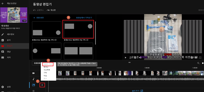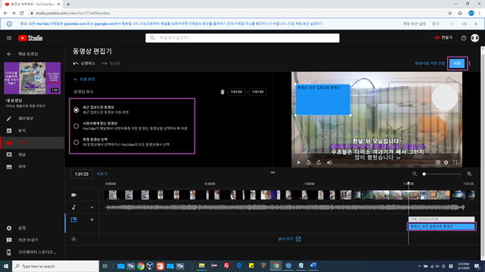 추천 동영상(동영상 최근 업로드한 영상)을 클릭하면 동영상 요소를 선택할 수 있다.