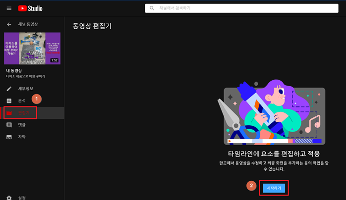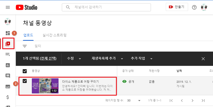 1) 유튜브 동영상 업로드 2) 구독 버튼 추천 동영상 추가 3) 재생목록 추가 4) 필요시 업로드한 동영상 정보 수정