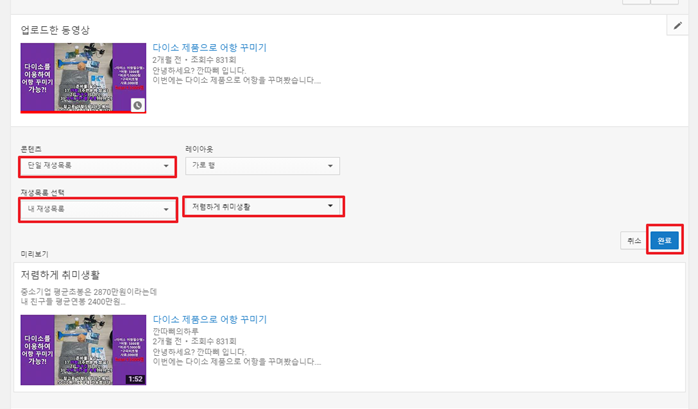 자신이 원하는 <구독> 버튼과 추천 동영상 요소를 선택 한 후 저장을 누른다.