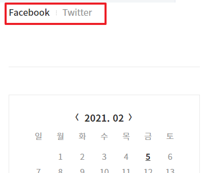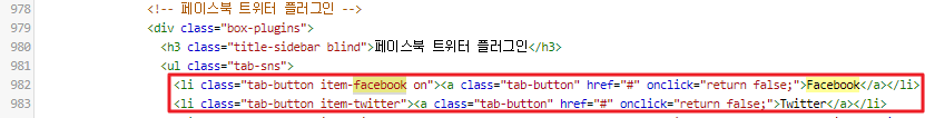<!-- -->은 주석으로 컴퓨터가 인식하지 않게 됩니다. 저 부분을 지워도 되지만 혹시 나중에 facebook과 twitter을 추가하게 될 경우 사용할 수도있기 때문에 주석으로 처리해주시는 것을 추천합니다.