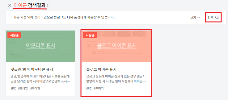 2) 관리자 페이지 -> 플러그인 -> 아이콘 검색 -> 블로그 아이콘 표시 적용