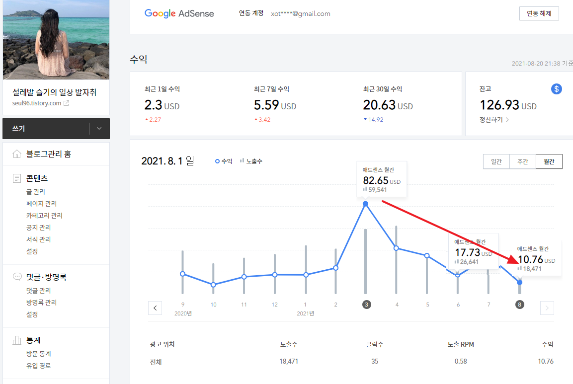 3월을 보면 82.65$로 좀 더 열심히 하면 한달에 100$도 가능하겠다는 희망을 심어줍니다. 하지만 6월에 17.73으로 거의 4분의 1토막 이상이 나더니.. 8월이 거의 끝나가는데 10.76$입니다. 거의 7분의 1토막이났죠.