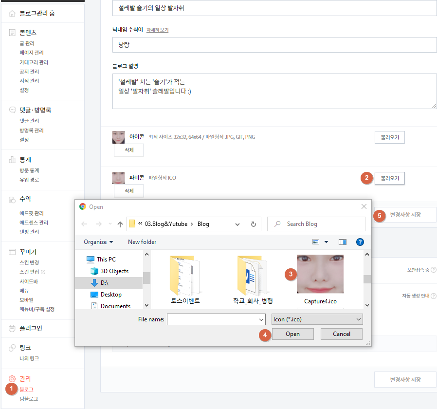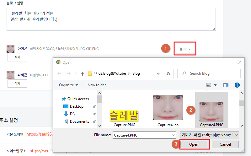 그래서 특징을 잘 나타낼 수 있도록 ‘설레발 슬기의 일상 발자취’로 변경했습니다. 블로그 설명, 아이콘/파비콘도 설정해주었습니다.