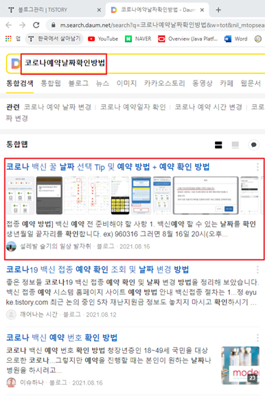 예를 들어 코로나 백신 예약하는 방법에 대한 글을 올렸는데 사람들이 코로나 예약날짜 확인 방법 이라고 검색해서 제 글을 들어온다는 것을 확인할 수 있습니다. 또한 코로나 예약날짜 확인방법이라고 검색하면 제 글이 첫번째로 뜨는 것도 확인할 수 있습니다.