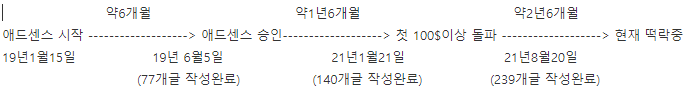 19년 1월 15일에 처음으로 애드센스 티스토리를 시작해서, 77개글을 작성하고 6개월 후에 애드센스 승인이났었습니다. 승인만 나면 끝이라고 생각했는데 웬걸... 100$가 넘어야 꺼낼 수 있는 애드센스의 조건을 만족하기 위해서 1년 6개월이라는 시간이 또 걸리고, 140개 글이 작성되었습니다.