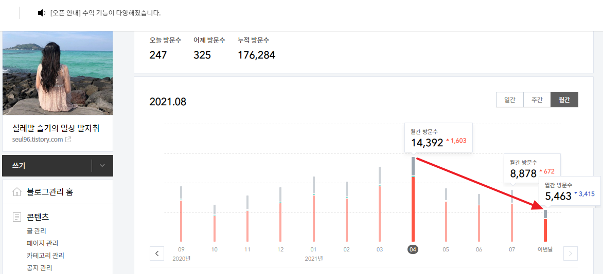 마지막으로 통계를 살펴보겠습니다. 위에서 방문자와 수익 통계를 살펴봤듯이 블로그에서 통계는 매우 중요합니다. 통계를 살피면서 블로그의 상태를 다시 한번 체크할 수 있습니다.