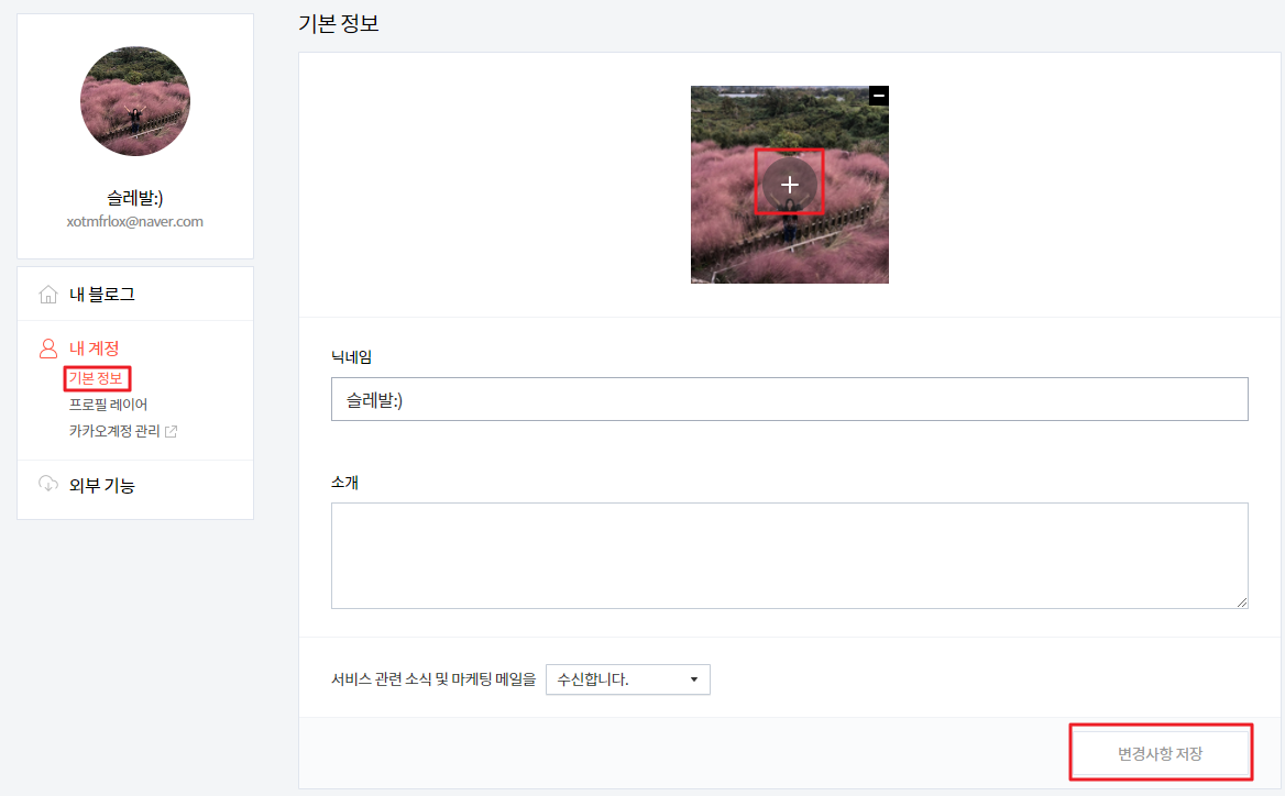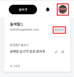 오른쪽 맨위 클릭 -> 계정관리 -> 기본 정보(내 계정) -> + 클릭 -> 사진 선택 및 Open -> 변경사항 저장