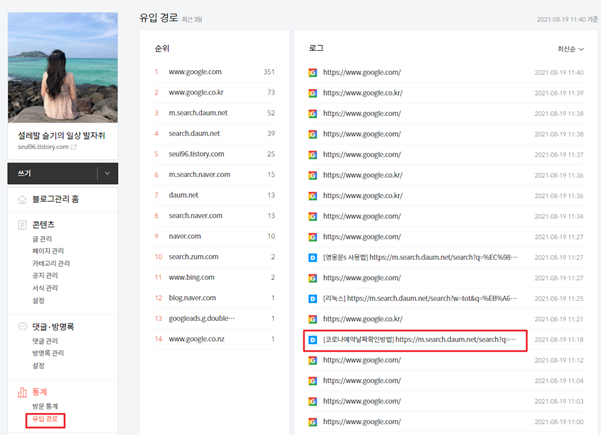 - 유입 경로: 방문자가 어떤 포털 사이트로 접속했는지 확인할 수 있습니다. 또한 로그를 클릭해보면 어떠한 키워드 조합으로 유입이 되었는지 알 수 있습니다.