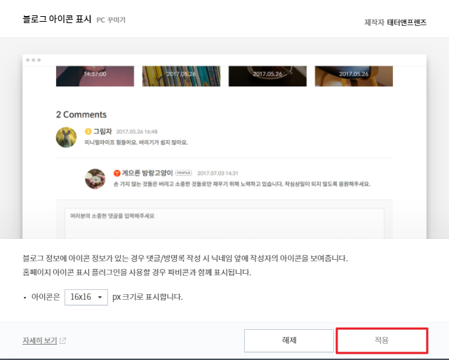 아이콘은 이렇게 등록하지만, 댓글이나 방명록에 아이콘을 표시하고 싶으면 한단계를 더 거쳐야 합니다.