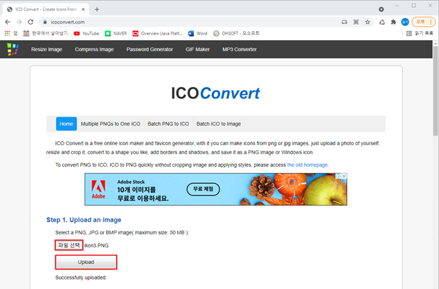 사이트 접속 -> 파일 선택 -> Upload -> Convert ICO -> Download your icon(s) -> ikon~.ico 사용