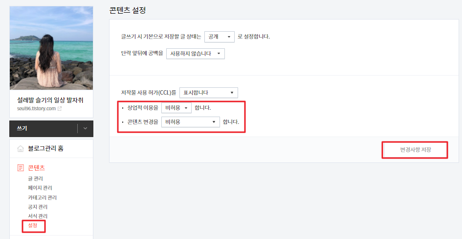 열심히 작성한 글을 상업적으로 이용하지 못하게 상업적 이용을 비허용으로, 콘텐츠 변경을 비허용으로 하는 것을 추천합니다.