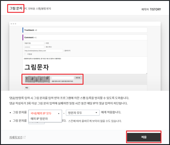 댓글/방명록 스팸들을 차단해 준다는데 저는 사실 댓글에 스팸이 달린적이 한번도 없어서 필요성을 못느껴서 사용하지 않겠습니다. 만약 제 블로그에 스팸 댓글이 달린다면 사용해보도록 하겠습니다.
