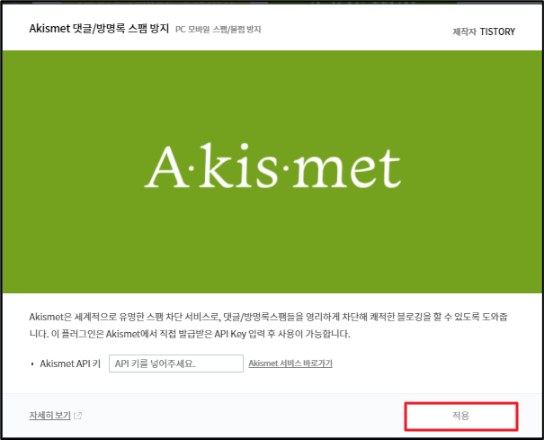 다른 플러그인과 다르게 Akismet API를 발급 받은 후 적용해야 합니다.