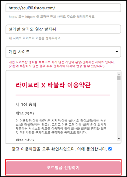 주소와 사이트 이름(본인 마음대로) 개인 사이트를 체크하고 코드를 발급해주세요.