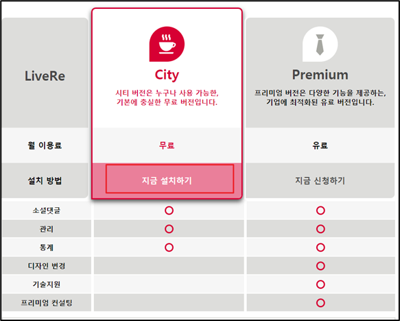 LiveRe 월 이용료 설치 방법 city image City 시티 버전은 누구나 사용 가능한, 기본에 충실한 무료 버전입니다. 무료 Premium image Premium 프리미엄 버전은 다양한 기능을 제공하는, 기업에 최적화된 유료