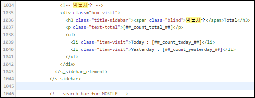 또한 ##_count_total_##일 경우에는 ##_count_today_##(오늘 방문자수)와 ##_count_yesterday_## (어제 방문자수)가 필요하지만 ##_StatisticsGraph_##는 어제 오늘 방문자수가 필요 없기 때문에 주석(<!-- -->) 처리 후 ##_StatisticsGraph_##를 추가해준다. (아래 소스코드 참고)
