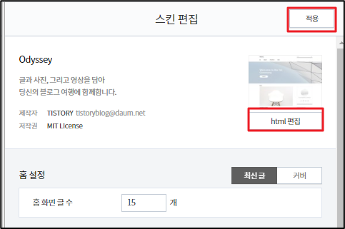 관리자 페이지 -> 스킨 편집(꾸미기) -> html 편집 -> 편집 -> 적용 -> 새로고침