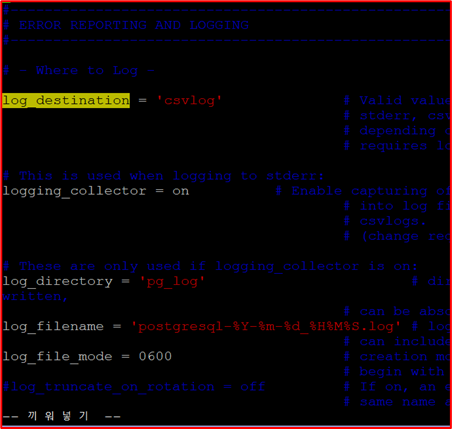 1번에서 찾았던 postgres conf 파일을 열어 아래와 같이 log 관련 설정들을 수정해줍니다.