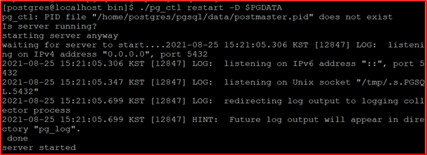 [postgres@localhost bin]$ ./pg_ctl restart -D $PGDATA