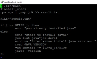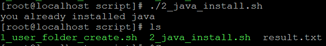 | [설치되어있을 때 결과값] [root@localhost script]# ./2_java_install.sh you already installed java [root@localhost script]# ls 1_user_folder_create.sh 2_java_install.sh result.txt |