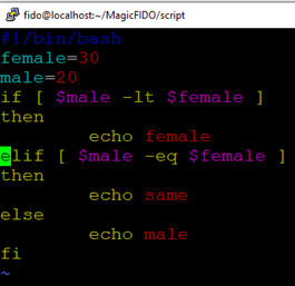 | #!/bin/bash female=30 male=20 if [ $male -lt $female ] then echo female elif [ $male -eq $female ] then echo same else |