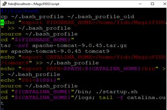 | #!/bin/bash cp ~/.bash_profile ~/.bash_profile_old echo "export FIDOBASE_HOME=/home/fido/MagicFIDO" >> ~/.bash_profile source ~/.bash_profile cd "${FIDOBASE_HOME}" tar -xvf apache-tomcat-9.0.45.tar.gz mv apache-tomcat-9.0.45 tomcat9 echo "export CATALINA_HOME=/home/fido/MagicFIDO/tomcat9" >> ~/.bash_profile echo "export PATH=$PATH:${CATALINA_HOME}/bin" >> ~/.bash_profile echo "PS1=${PS1}" source ~/.bash_profile cd "${CATALINA_HOME}"/bin; ./startup.sh cd "${CATALINA_HOME}"/logs; tail -f catalina.out |