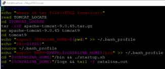 | #!/bin/bash echo "where is tar file?(FULL location):" read TOMCAT_LOCATE cd $TOMCAT_LOCATE tar -xvf apache-tomcat-9.0.45.tar.gz mv apache-tomcat-9.0.45 tomcat9 cd tomcat9 echo "export CATALINA_HOME=$(pwd)" >> ~/.bash_profile echo "PS1=${PS1}" source ~/.bash_profile echo "export PATH=$PATH:${CATALINA_HOME}/bin" >> ~/.bash_profile cd "${CATALINA_HOME}"/bin && ./startup.sh cd "${CATALINA_HOME}"/logs && tail -f catalina.out |
