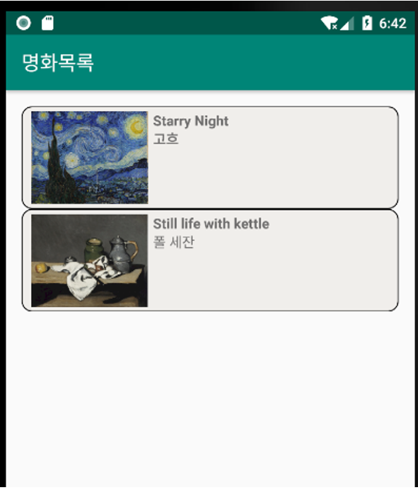 여러 개의 명화 이미지 목록을 만들어 보자. 목록의 각 아이템은 왼쪽에 이미지를 배치하고 오른쪽에는 위에 명화 제목, 그 아래에는 작가를 배치하자. 어플리케이션 이름은 Image2 어플리케이션 라벨과 액티비티 라벨은 명화목록으로 하는 프로젝트를 개발해 본다. 다음은 이미지 목록을 출력하면서 각 아이템에 둥근 모서리의 사각형 모양이 나오도록 shape drawable resource들을 적용한 예이다.