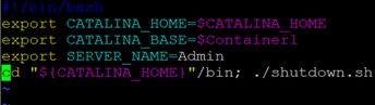 | #!/bin/bash export CATALINA_HOME=$CATALINA_HOME export CATALINA_BASE=$Container1 export SERVER_NAME=Admin cd "${CATALINA_HOME}"/bin; ./shutdown.sh ![]() |