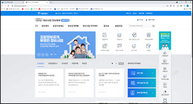 재개발, 재건축 등 정비사업을 투명하게 공개하기 위하여 서울시에서 구축한 사이트이다.