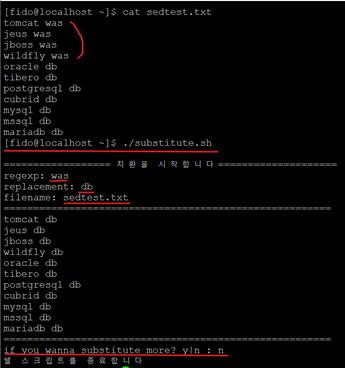 | [fido@localhost ~]$ cat sedtest.txt tomcat was jeus was jboss was wildfly was oracle db tibero db postgresql db cubrid db mysql db mssql db mariadb db [fido@localhost ~]$ ./substitute.sh ========= 치환을 시작합니다============ regexp: was replacement: db filename: sedtest.txt ================================== tomcat db jeus db jboss db wildfly db oracle db tibero db postgresql db cubrid db mysql db mssql db mariadb db ================================ if you wanna substitute more? y|n : n 쉘 스크립트를 종료합니다 |