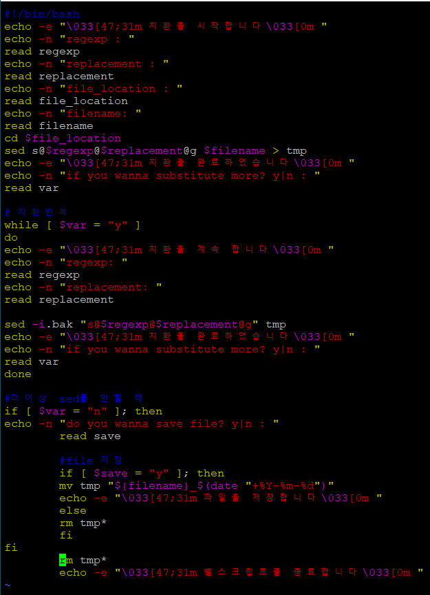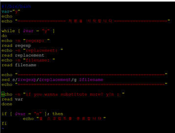 | #!/bin/bash var="y" echo echo "=========== 치환을 시작합니다===========" while [ $var = "y" ] do echo -n "regexp: " read regexp echo -n "replacement: " read replacement echo -n "filename: " read filename echo "========================================" sed s/$regexp/$replacement/g $filename echo "========================================" echo -n "if you wanna substitute more? y|n : " read var done if [ $var = "n" ]; then echo "쉘 스크립트를 종료합니다" fi |