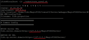 | [fido@localhost ~]$ ./substitute_save2.sh =========== 치환을 시작합니다============= regexp: 10.10.30.34 replacement: 127.0.0.1 file_location: /home/fido/MagicFIDO/tomcat9/Server/webapps/MagicFIDO2Server/WEB-INF/config/fido filename: fido.properties ======================================= ############################# # Common Config ############################# #FIDO Server URL fido.server.domain=http://127.0.0.1/MagicFIDO2Server/ include=default.properties =============================== if you wanna substitute more? y|n : n do you wanna save file? y|n : y 쉘 스크립트를 종료합니다 |