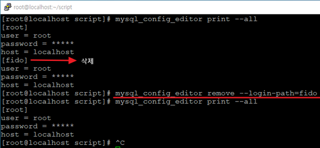 ex) [root@localhost script]# mysql_config_editor print --login-path=root
