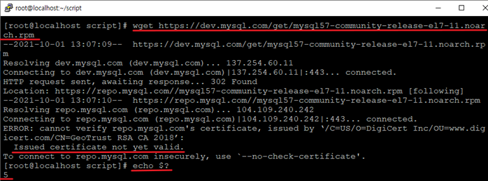 mysql을 설치하는 wget 명령어가 성공했을 시에는 관련 패키지를 다운받는 sudo rpm -ivh mysql~이 실행되고, 실패시에는 mysql install이 failure했다는 문구가 뜨는 쉘 스크립트 입니다.