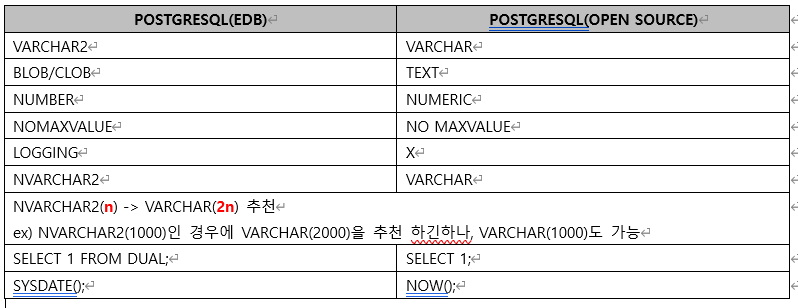 SQL문을 작성했을 때, 유료 버전인 EDB에 맞춰 sql을 생성했다가, 고객사가 무료버전(open source)을 사용한 다는 것을 알고 데이터 형식을 수정하였다.