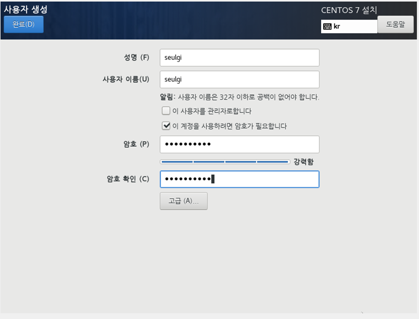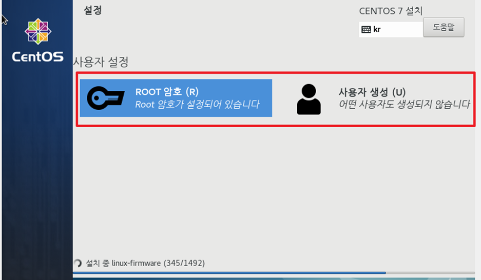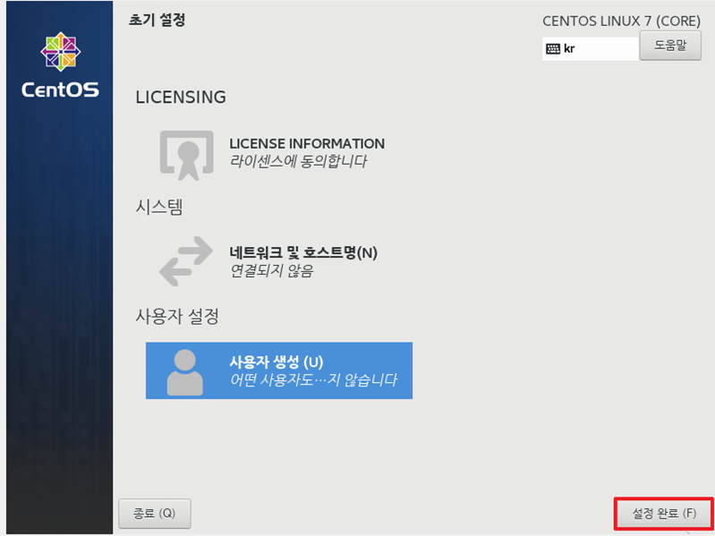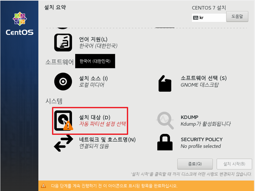 이렇게 설정하고 설치시작을 누르면 root 암호를 설정하고 root를 제외한 어느 사용자도 만들라고 안내문구가 뜬다.
