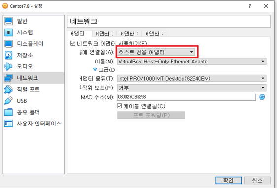 참고로 호스트 전용 어댑터로 설정하면 외부 인터넷이 안되기 때문에 yum과 같은 설치가 당연히 되지 않는다.
