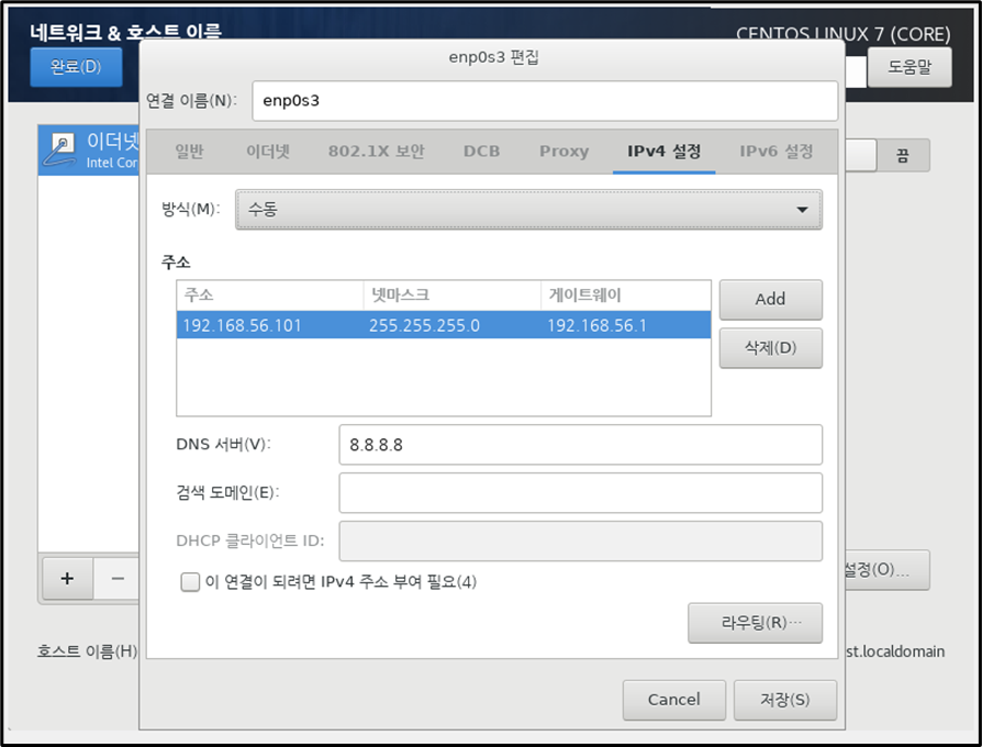 | 아무것도 설정하지 않고 완료 해도된다 (아래에 다시 설정하는 방법이 나오니까 완료 해도 된다~) (CentOS7) vi /etc/sysconfig/network-scripts/ifcfg-enp0s3 (CentOS6) vi /etc/sysconfig/network-scripts/ifcfg-eth0 에서 다시 수정할 수 있기 때문이다. ip 주소, static/dhcp 등 다 다시 수정할 수 있다. 하지만 이번에는 아래와 같이 설정해주었다. address:192.168.56.101 netmask:255.255.255.0 gateway:192.168.56.1 dns server:8.8.8.8 이번에 구성하고 싶은게 인터넷이 안되는 폐쇄망이라서 DNS 설정을 안 해도 되지만 해주었다. |