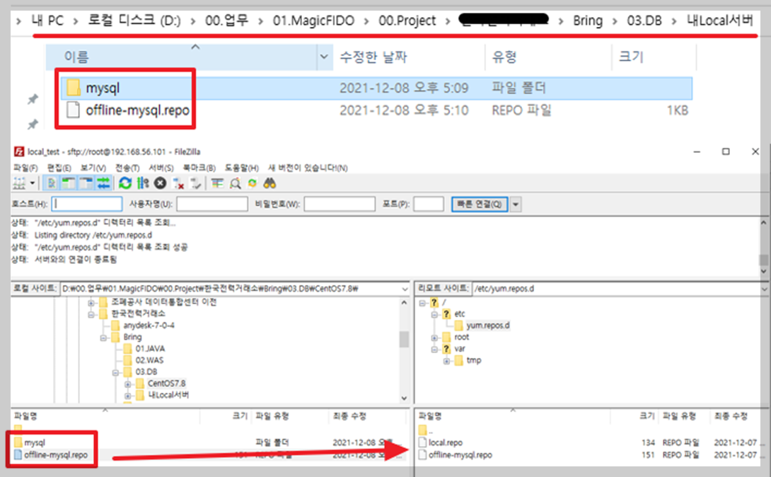 3.1 폐쇄망 서버의 동일한 경로에 아래 두 폴더와 파일 업로드(파일질라를 사용함.)