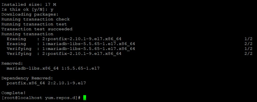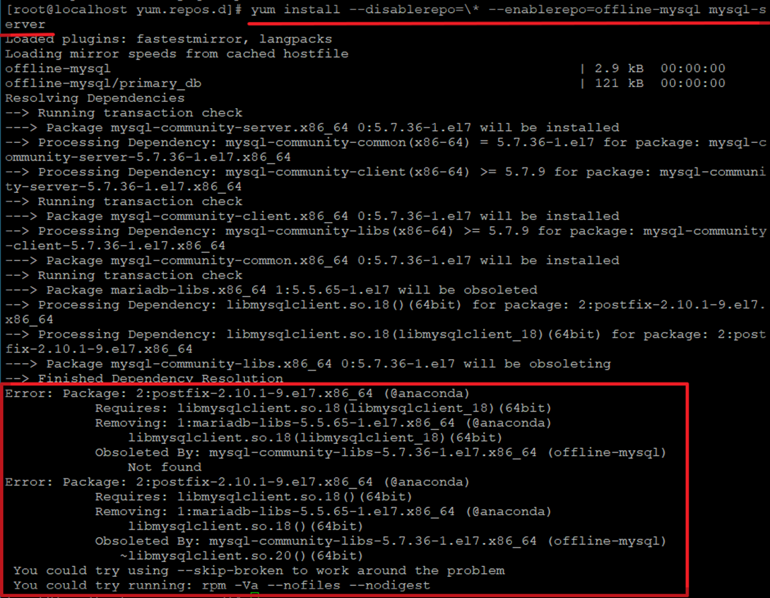 | Error: Package: 2:postfix-2.10.1-9.el7.x86_64 (@anaconda) Requires: libmysqlclient.so.18(libmysqlclient_18)(64bit) Removing: 1:mariadb-libs-5.5.65-1.el7.x86_64 (@anaconda) libmysqlclient.so.18(libmysqlclient_18)(64bit) Obsoleted By: mysql-community-libs-5.7.36-1.el7.x86_64 (offline-mysql) Not found Error: Package: 2:postfix-2.10.1-9.el7.x86_64 (@anaconda) Requires: libmysqlclient.so.18()(64bit) Removing: 1:mariadb-libs-5.5.65-1.el7.x86_64 (@anaconda) libmysqlclient.so.18()(64bit) Obsoleted By: mysql-community-libs-5.7.36-1.el7.x86_64 (offline-mysql) ~libmysqlclient.so.20()(64bit) You could try using --skip-broken to work around the problem You could try running: rpm -Va --nofiles --nodigest |