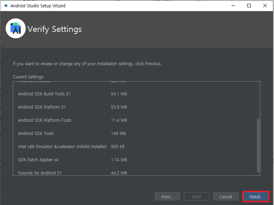 마지막으로 Finish를 누르면 Android Studio 설치가 끝이납니다.
