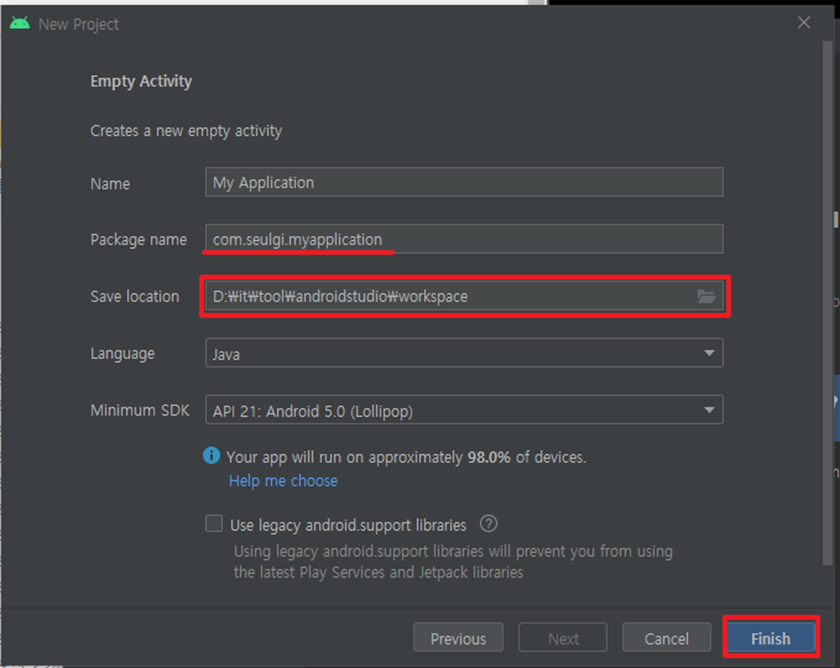 Name, Package name, Save location, Launguage를 수정해준다.(Default 값으로 사용해도 괜찮음)