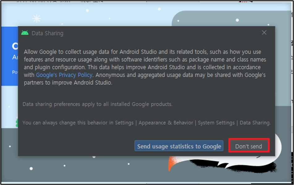저는 구글에 데이터를 전송하지 않을 것이기 때문에 Don’t send를 선택했습니다.